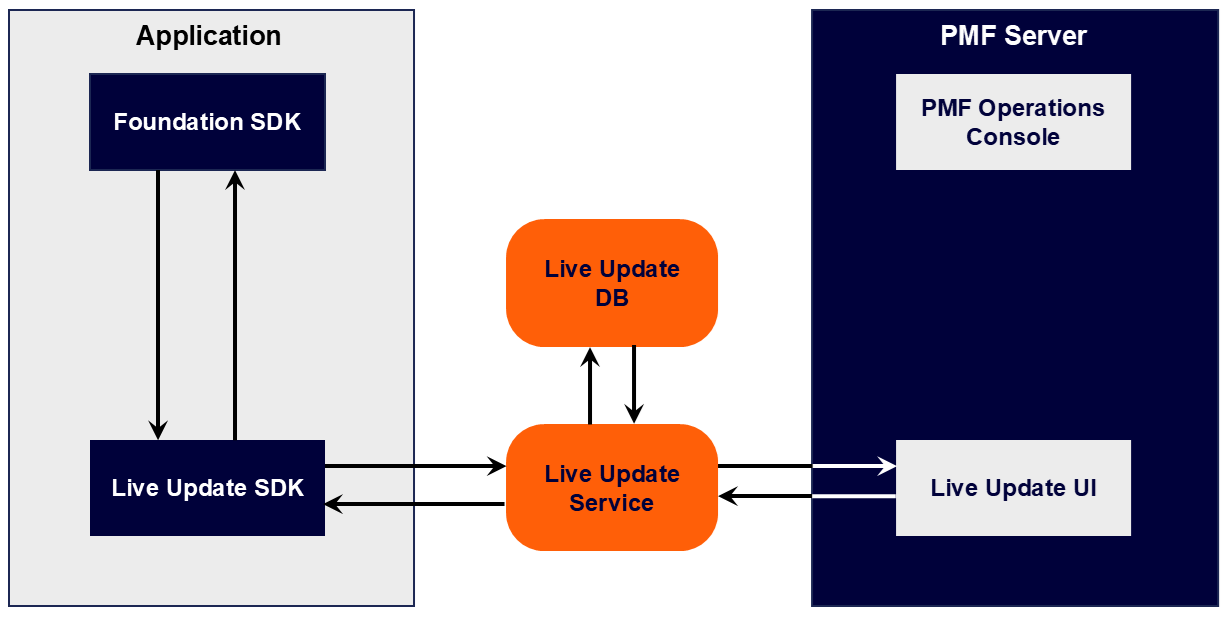 - Client-side SDK: the Live Update SDK is used to retrieve and access configuration elements such as features and properties from the PMF Server.